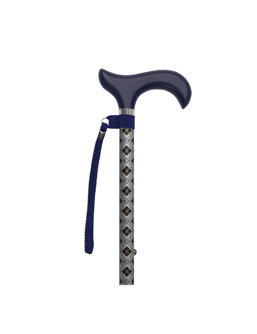 Bastone in alluminio regolabile in altezza, colore fantasie geometriche con manico in legno Blu, disponibile nella versione tubo intero o pieghevole. Puntale in gomma Blu.