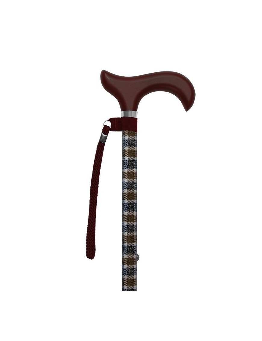Bastone in alluminio regolabile in altezza, colore fantasie geometriche con manico in legno Marrone, disponibile nella versione tubo intero o pieghevole. Puntale in gomma Marrone.