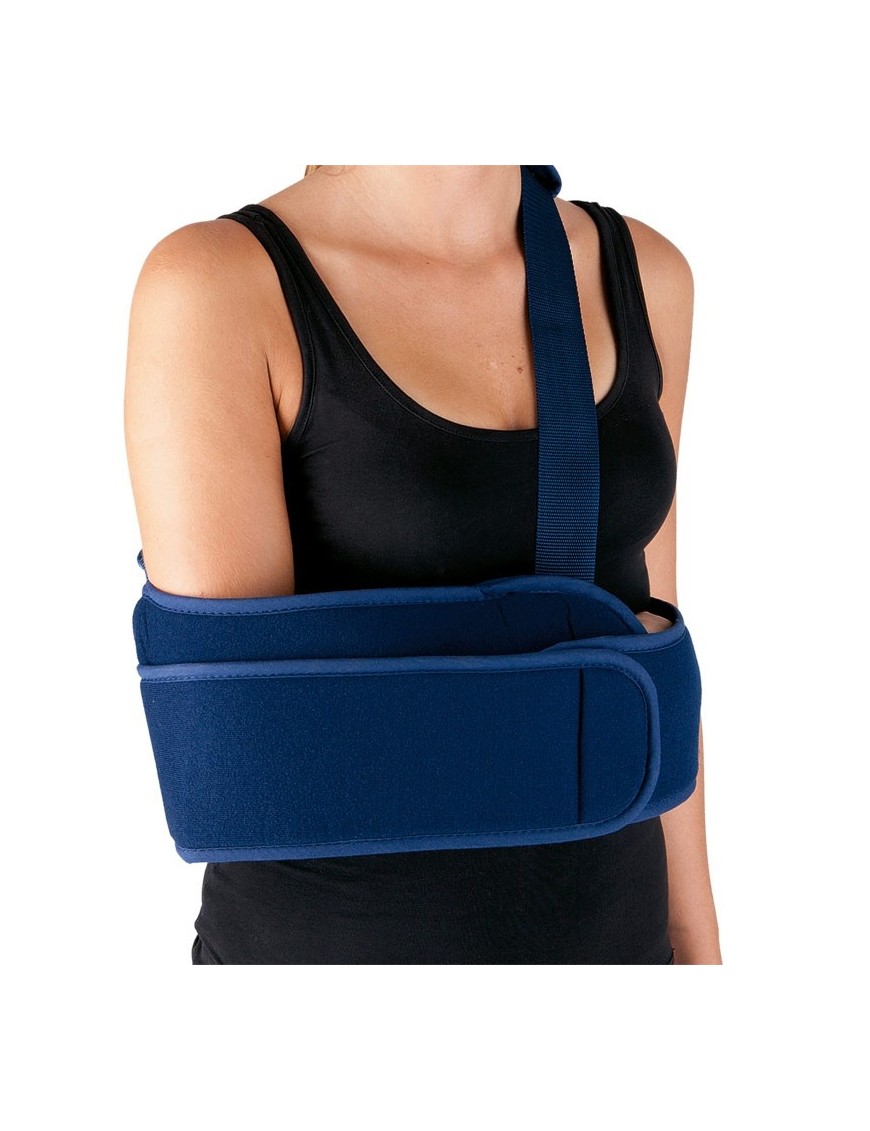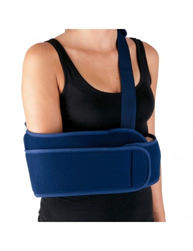 Immobilizzatore braccio spalla avvolgente con fascia d'immobilizzazione e cintura regolabile a tracolla. Chiusura a velcro.
